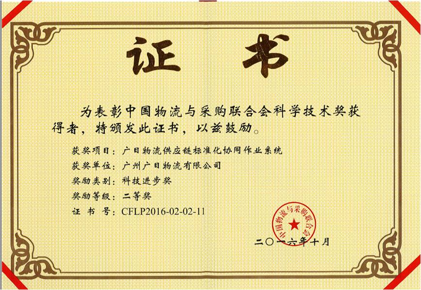 2016年10月,廣日物流憑借“廣日物流供應鏈標準化協(xié)同作業(yè)系統(tǒng)”項目榮獲由中國物流與采購聯(lián)合會頒發(fā)的“2016年科技進步獎二等獎”。中國物流與采購聯(lián)合會的科學技術(shù)獎由國家科學技術(shù)獎勵辦公室批準設立,旨在獎勵全國物流與采購以及生產(chǎn)資料流通領域中的技術(shù)發(fā)明與科學技術(shù)進步成果。